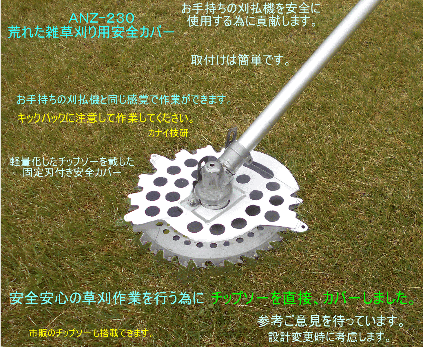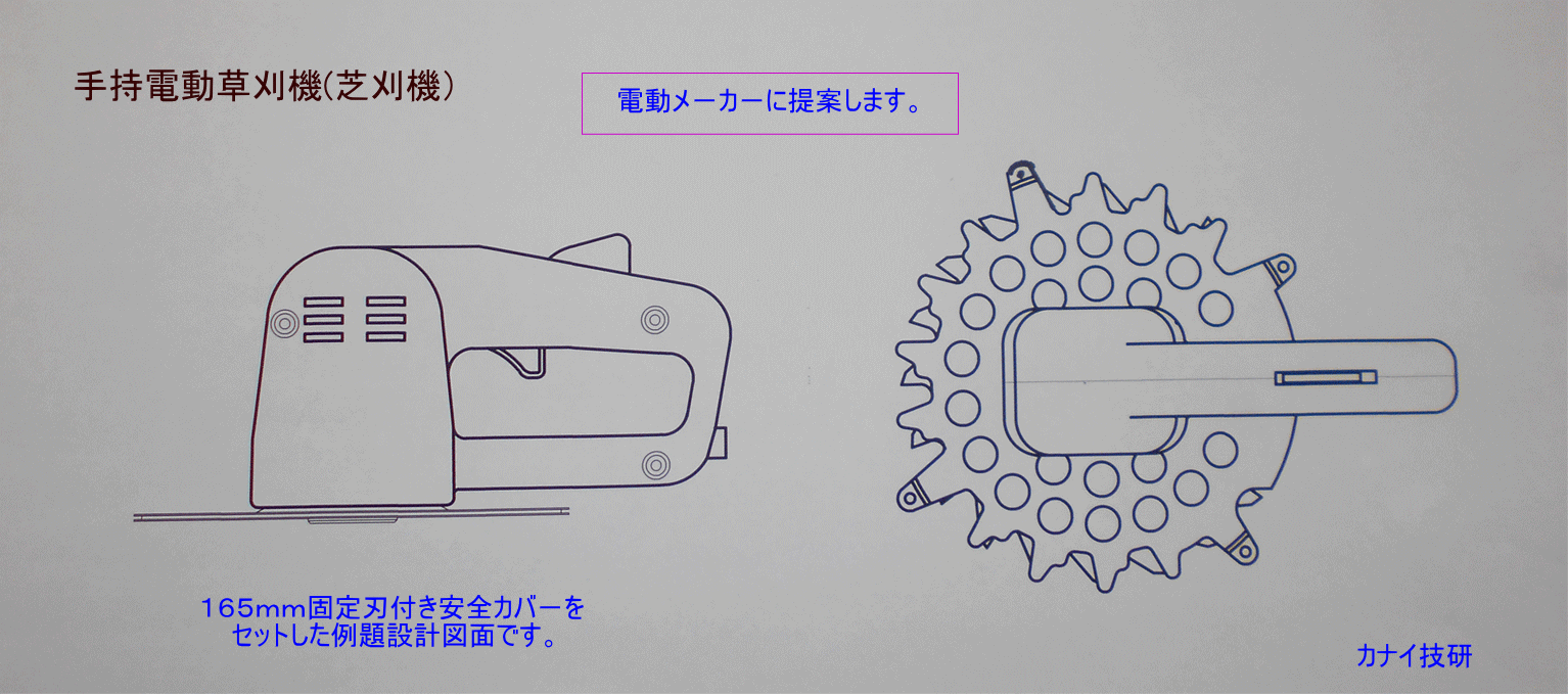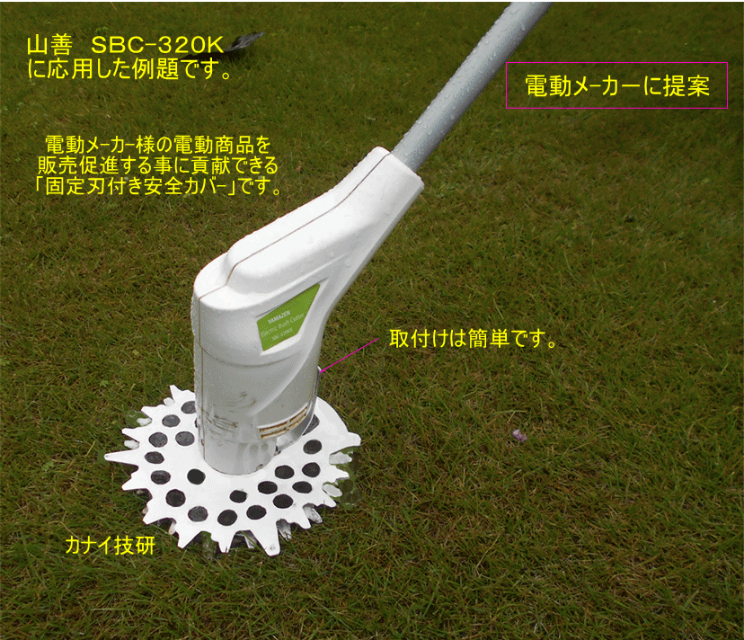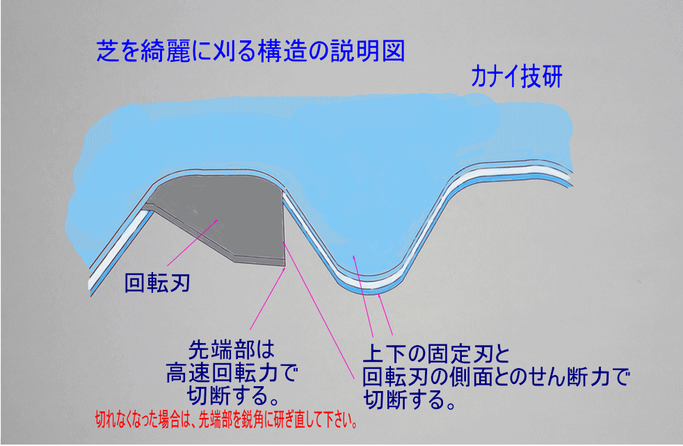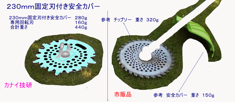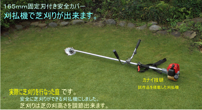 - カナイ技研は安全で安心して、草刈り作業をする事は勿論のこと、不可能と諦めていた「芝刈り」が出来る様にする為に、回転刃の上下面に「固定刃」を設けて、回転刃を完全に保護して、回転刃の露出を無くした構造の「固定刃付き安全カバ-」を開発しました。