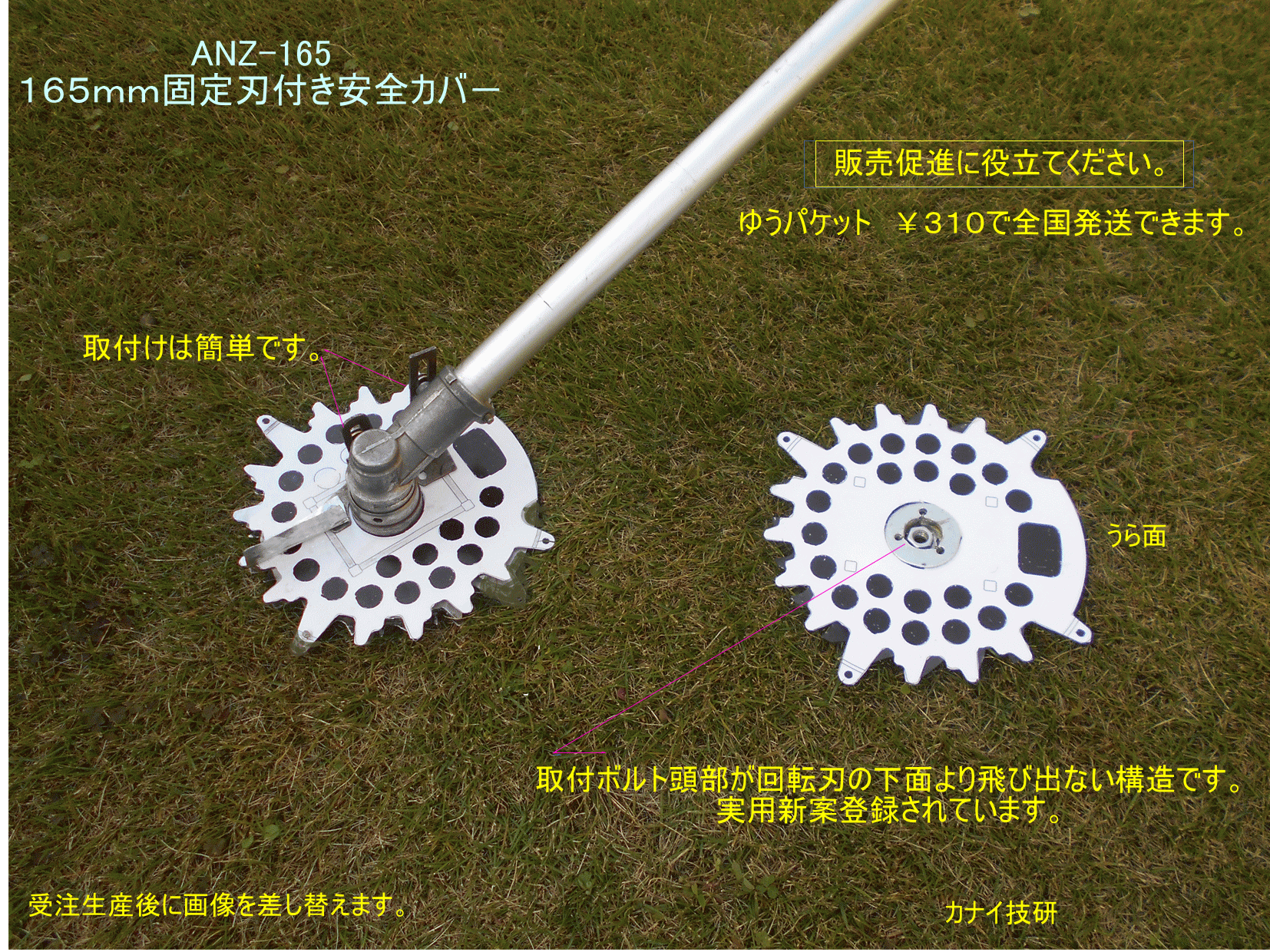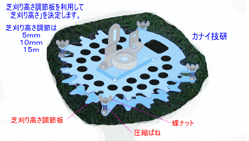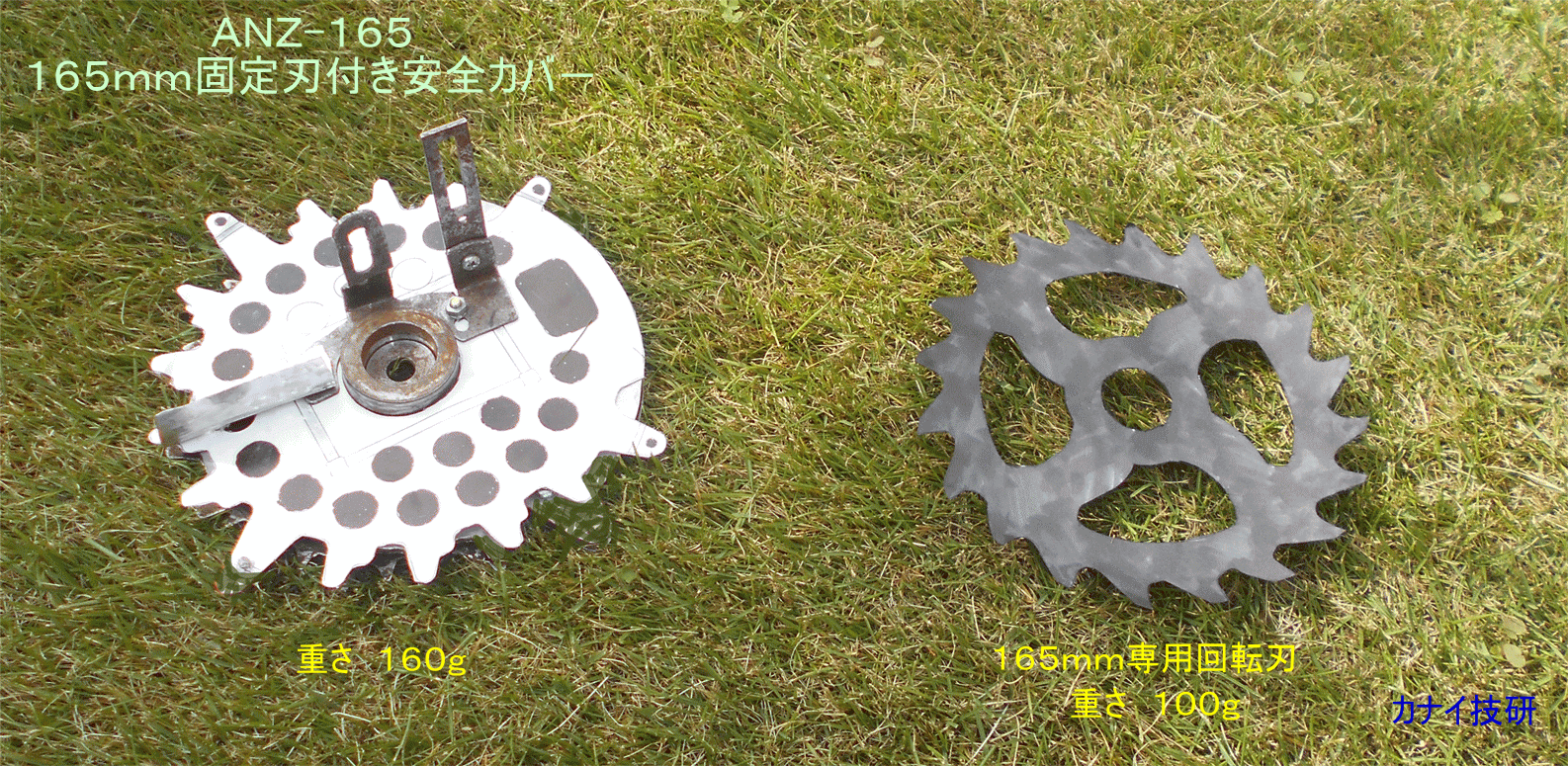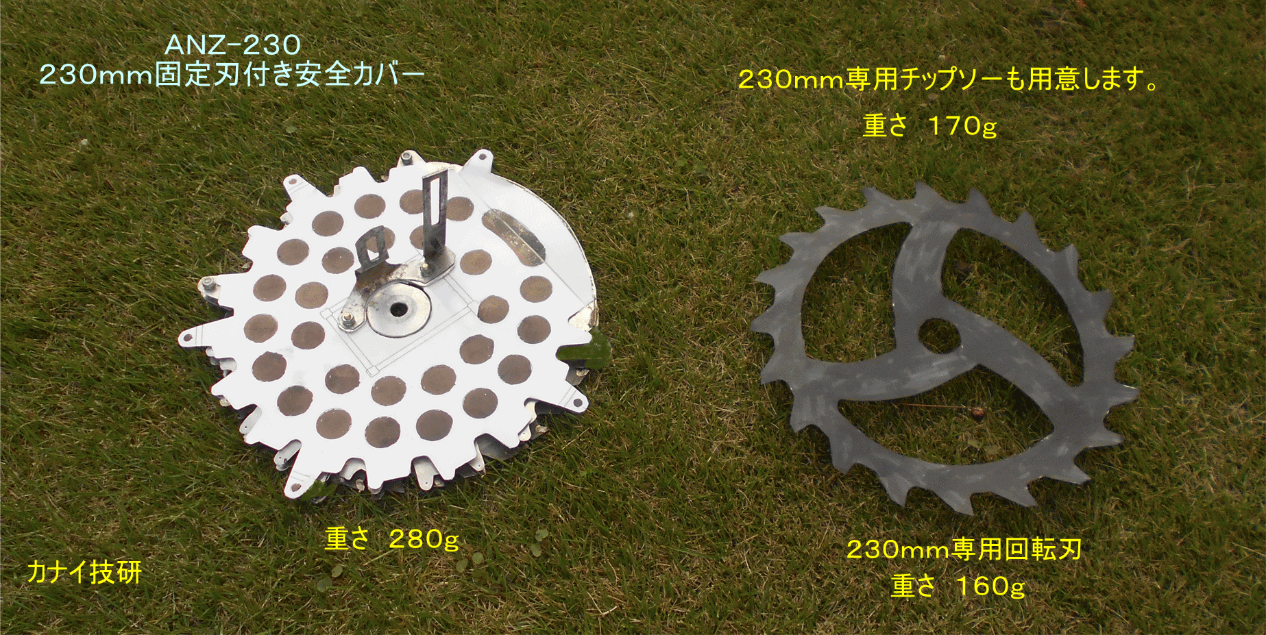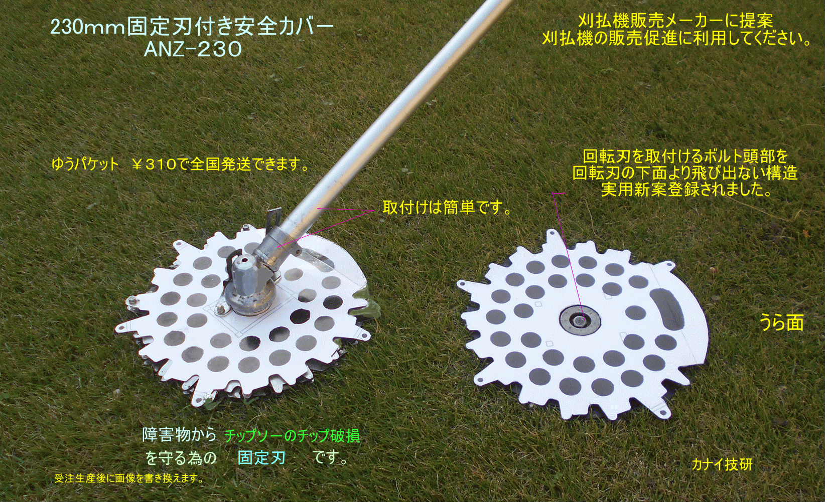 - カナイ技研は安全で安心して、草刈り作業をする事は勿論のこと、不可能と諦めていた「芝刈り」が出来る様にする為に、回転刃の上下面に「固定刃」を設けて、回転刃を完全に保護して、回転刃の露出を無くした構造の「固定刃付き安全カバ-」を開発しました。